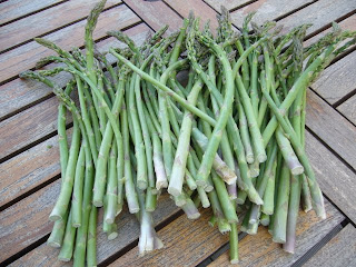 The green stuff, on the other hand, is not easy to get hold of. To be honest, it's been one of the few food disappointments since moving here. Even the green asparagus I have managed to find has been monstrously fat like its white cousin. But ... this year we have a new producer at our market. And they're selling no less than 9 varieties and grades of asparagus, including - oh deep joy - two sorts of green: the fat stuff, and real, proper thin spears. No carefully weighed, neatly trimmed bunches here: there are great mounds of it, lying loose for the picking, for only 2.80 euros a kilo. We bought some last week and it was so good we went back for more - lots more - today. As I was shovelling handfuls of it into a piece of newspaper a French woman, curious at my buying habits, asked me what it tasted like. Now that's not an easy question. In the end I broke her off a piece of try raw. Her eyes lit up. She bought four kilos. The revolution is here ...