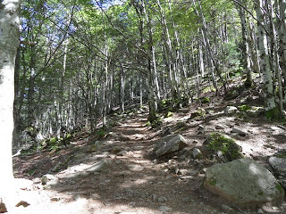 It's not a difficult walk; the path winds up through a beech forest, beginning as a wide rocky track and then gradually narrowing and getting steeper until for the last part you effectively find yourself clambering up a staircase of rocks.