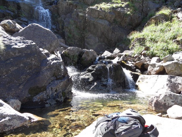 In three sections and some 240 metres high in total, the main - middle - section alone falls for well over 100 metres. The path - at this point the GR10 - takes you steeply up another 150 metres until you're level with the second 'landing' of the waterfall; from here you can clamber over the rocks and sit underneath. And so we did.