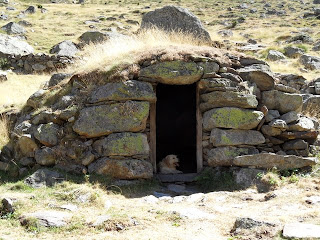 An orri is a low, round shepherds' hut found up on the estives - the summer high pastures - built entirely of dry stone (ie no mortar) and often topped with turf, or sometimes with slate. The design hasn't changed since the Middle Ages, when various confreries or guilds (some of which still exist today) were given the right to construct them on land owned by the local count, or king, or whoever; in some places - and we were in one of them - the orris were grouped into small hamlets, often around a communal courtyard. Until early last century, they would be occupied through the summer months not just by the shepherd but also by a part of his family, while the rest of the family remained down in the valleys to look after the crops; they would be used not just for habitation but also for cheesemaking, for the shepherd was also a fromager. Les Orris de Carla, closest to the lake at Soulcem, were in use until 1968.