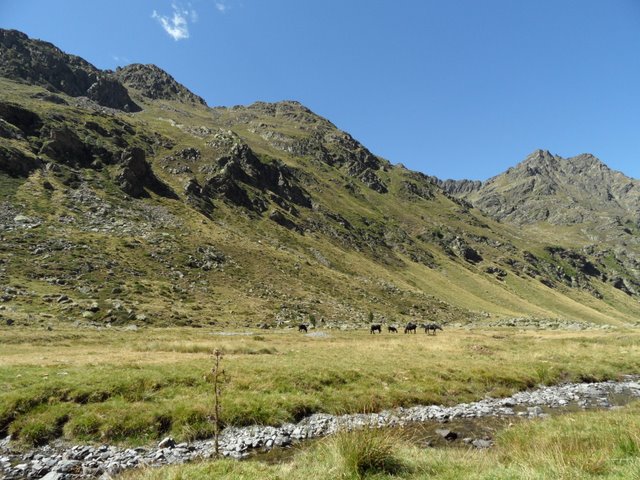 After a while you reach a gate leading to the estive - summer pasture - area; we passed through herds of cattle (including a magnificent and fortunately peaceable bull), horses and mules who were in the main not only curious about us but sociable too.