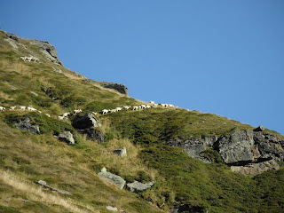 Much higher up the path on the grassy mountainside we encountered a shepherd moving a huge herd of sheep from one grazing area to another. We sat quietly and watched for a long time; the communication between him and his dog, a Border Collie, was almost mystical - none of the arm waving and almost constant yelling of One Man and His Dog (a series of TV programmes popular in the 1980s that set British sheep farmers and their dogs in competition with each other in various sheep dog-y exercises), but just eye contact and the occasional trill or other sound. If you click on the picture to enlarge it, you'll just see the shepherd standing on a rocky outcrop.