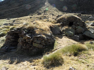 An orri is a low, round shepherds' hut found up on the estives - the summer high pastures - built entirely of dry stone (ie no mortar) and often topped with turf, or sometimes with slate. The design hasn't changed since the Middle Ages, when various confreries or guilds (some of which still exist today) were given the right to construct them on land owned by the local count, or king, or whoever; in some places - and we were in one of them - the orris were grouped into small hamlets, often around a communal courtyard. Until early last century, they would be occupied through the summer months not just by the shepherd but also by a part of his family, while the rest of the family remained down in the valleys to look after the crops; they would be used not just for habitation but also for cheesemaking, for the shepherd was also a fromager. Les Orris de Carla, closest to the lake at Soulcem, were in use until 1968.