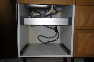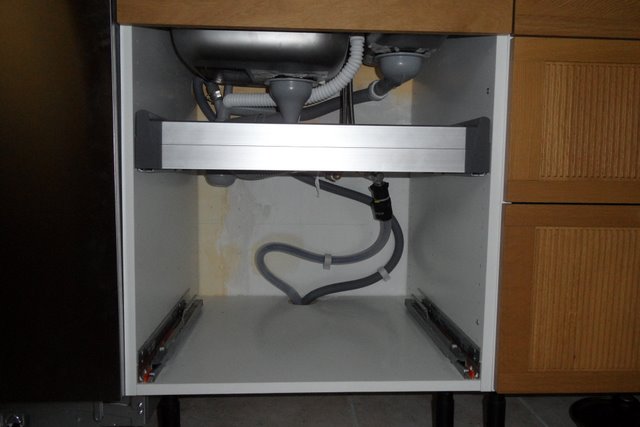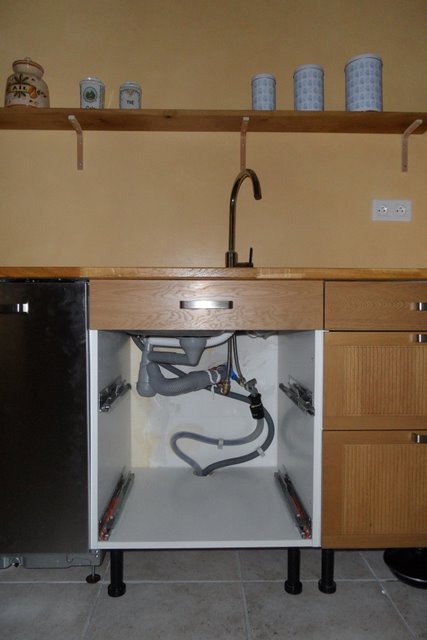 Not the prettiest bit of plomberie you've ever seen, quoi? Ugly-and-out-of-sight we can live with (sort of), but there's a problem: this is not just a sink unit, it's an all-singing all-dancing double-drawered small-mortgageable dooflop thingie that holds not only all the usual under-sink stuff but also a special system for sorting three types of recycling. And there is no space to get either drawer in, let alone both. This has of course been delicately raised in my absence with the plumber, who pronounces that "it cannot be done". "Okay", says John, "do what you can", this usually, in the land where 'it's impossible' means no such thing, being quite enough to turn no into yes.