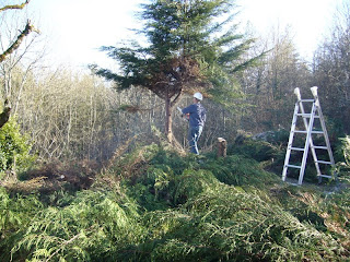 Oh frabjous day ... the leylandii are no more! A couple of hours on the chainsaw, eight hours chopping and shredding, fifty or so big bags of shreddings hauled up to our woodland and scattered to make a carpet ... and we have light. Although there's still a lot of work to do, it's already transformed that part of the garden - and take note, dear guests-of-the-future: see that huge pile of green on the ground? That is (or at least will be when it grows up) your south-east facing, and now unopposedly sunny, breakfast terrace!