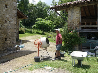 Originally, John was going to take charge of all the outside work to create terraces and steps and paths and things while I acted as his labourer. But, well, you know how it is. Being anybody's labourer is not my strong point. I much prefer to be out there, leading from the front. John, meanwhile, is much more easy going and is quite happy to do things my way ... which is probably why he's tolerated living with me for longer than anyone else has, or would :-). So he's been overcoming a surprise phobia about mortar by manning the cement mixer, while I get to clamber around on my hands and knees laying screeds and trying to piece strangely shaped bits of stone together in such a way as they look as though they've always been there.