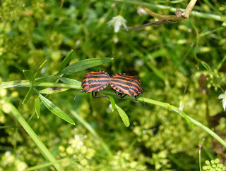 There are unforeseen advantages to spending four days with your nose against the ground. One early morning (it was so hot that we had to start work at 6.30 to avoid the mortar going off before I could work with it) I encountered these two striped shield bugs in a compromising position on some parsley stalks: