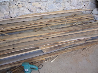 The chestnut was obviously Important. It had a mention on the inventory that came attached to our buying contract, and was valued at 400 euros. It had been used by our predecessors as volige in the part of the barn roof that had already been relaid, and we assumed that we'd use the rest of it to finish the job. The Perfectionist, however, had other ideas: "Merde alors, you can't use it for that!" he spluttered. Or words to that effect. And set out to find a hundred and one other places where it could be mis en valeur, as they say here - a wonderful expression which translates roughly to showing it off to its best advantage.