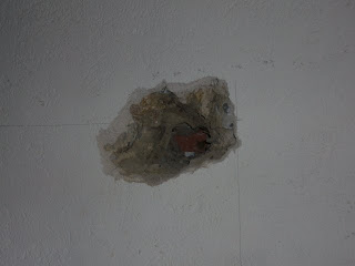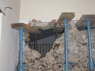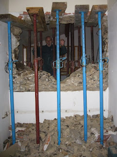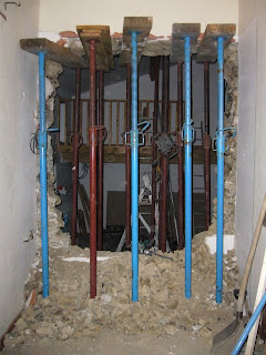It might (does!) feel like sheer madness right now, but we've all been waiting for this moment since the start of the work: this is where we finally connect the two parts of the house that up to now have been separate, with the only access from one to the other through a circuitous route that takes you via the cellar. The last two days have been a truly superhuman effort on the part of The Perfectionist, who's working largely on his own while we clear rubble, fetch, carry, make coffee, admire, and generally sympathise. (True, we do have him shut into the room behind the acro props, thus forcing him to hack his way out, but he doesn't mind. No, really, he doesn't ...).