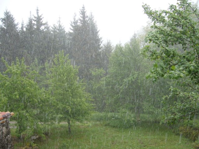 A wellie-booted foray down the track to see what was going on was quickly aborted as branches and trees were falling like dominos, but not before it became patently obvious that we were going nowhere fast. The track was an impassable obstacle course. A thick, heavy oak branch balanced squatly on top of the main high tension electricity cable. Gulp. We retreated back to hot porridge and gave thanks to the goddess of gas hobs.