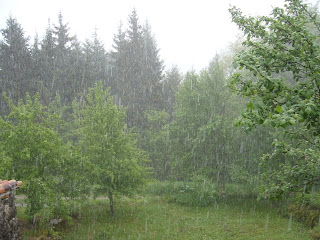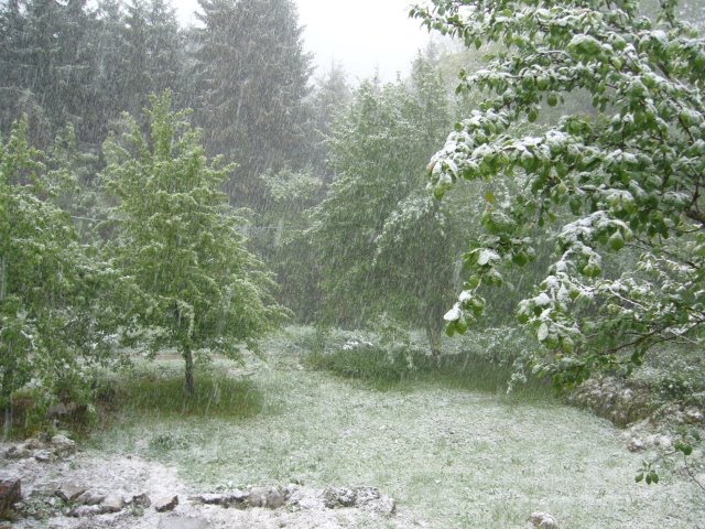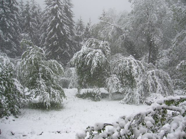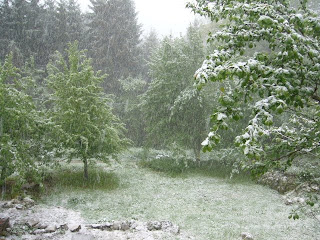 By eleven o'clock our world was white, and the newly-in-leaf trees all around were creaking under the strain. By half past all we could hear was the sound of tree branches snapping under the weight of the wet, heavy snow and, every so often, the more ominous crash of a larger tree falling. At midday, we lost electricity. An hour later, our mobile phone signal went the same way.