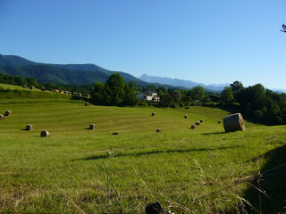 The scent and sound of haymaking fill the air from dawn to dusk, and pasture after pasture changes its appearance from shaggy to impossibly neat, each with its stash of round bales. Many of the cattle are up in the estives - the high altitude summer pastures - where it's cooler and the grass lush and filled with nutrients after its six month covering of snow. Tourists and visitors are arriving; summer-only shops and buvettes are opening. Paradoxically, villages appear deserted as shutters stay shut through the day to keep out summer heat (it's said that you can always spot the house of an Anglo-Saxon immigrant by their ever-open shutters). And each day the mountains are a little less white ...