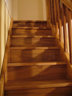 I've been stripping, sanding and re-finishing the staircase in La P'tite Maison, which was built and fitted by a local artisan well before our era, some twenty five years ago, but thanks to The Passing Of Time (not to mention builders' boots) was looking more than a little worse for wear. It's beautiful wood: I'm not quite sure what it is, though our neighbours seem to remember that it came from Morocco. And it's been one of those remarkably fast and very satisfying jobs, with (almost) Instant Gratification. What two days ago was scratched and sad and ugly now looks like this ...