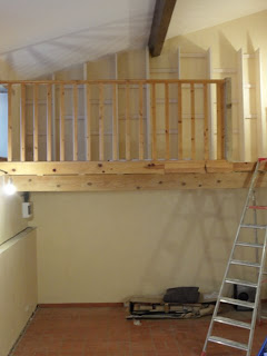 Have you ever noticed how things that you set up in your mind as terminally difficult actually turn out to be relatively straightforward (and vice versa)?. Just a week ago, we started to put up the bookshelves in the new dining room, which on its mezzanine level has an alter ego as a library. We swiftly discovered that the wall consisted of plasterboard dotted and dabbed onto hollow brick ... some 10 centimetres away from it. Now why oh why oh why would you do that?? The dots (or is it the dabs?) were dabbed (or dotted) at random, so no chance of screwing the shelves through them. And a brief attempt to fix through the placo and into the brick was not exactly successful - it chewed up the placo then fell out of the brick, in spite of the biggest wall plug in the world. Clearly there was nothing for it but to build a made-to-measure shelving system from scratch - a solution we'd hoped to avoid because of the bizarre dimensions of the space. Sigh. So with heavy hearts, a design was swiftly put together - to accommodate sloping walls, sloping ceiling and sloping floor - wood was duly bought, and over the week the carcasses were duly made (by John), lasured (by me), and hoisted up to the mezzanine (by both of us),