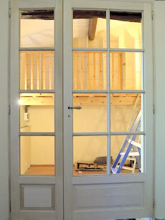 Which is just a great step forward, and gives us both the courage and the wherewithal to go on. So the next month (maybe more) will see us putting up a spiral staircase to the library area, building new oak steps down from the hall, fitting oak windowsills and skirting boards, repairing and sanding and finally painting the balustrade and window frames and doors, deep cleaning and oiling the terracotta tiles and building cupboards across the back wall using some reclaimed shutters we found in a local depôt vente.