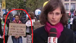 The placard reads: "Carla, on est comme toi, on se fait niquer par le chef d'état" ...