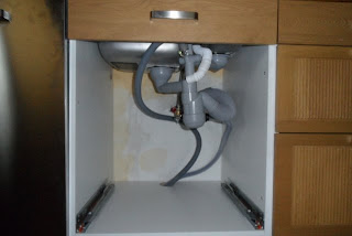 I have to go out (no, honestly, I do) so I leave him to John's tender mercies. When I get home there's good news and bad. The good news: the water heater has been successfully pressure-tested and wired in, and all the water and waste is connected. The bad news: there's an elephant in the cupboard under the sink.