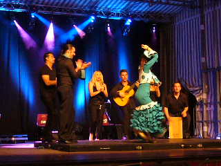 More fiesta ... this is the Compagnie Fuente Flamenca who produced some awesomely earthy and passionate flamenco: according to their 'blurb' they aim to "present a flamenco which is as close as possible to its source, without pretension or needless chatter; the artists sing, play and dance because they remember, with the element of mysterious, magical power - el duende - that arouses the memory of things not lived by themselves, but by those who created this art". One definition of duende: "duende is an inner spirit, which is released as a result of a performer's intense emotional involvement with the music, song and dance. If you experience a shiver of recognition, even for an instant, it means the duende has successfully transferred a lifetime's worth of joy and pain from the performer to you".