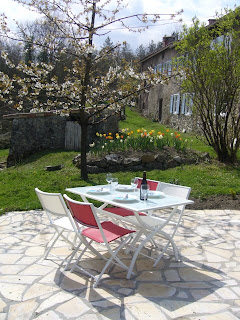 Large double glass doors give directly onto a gravelled terrace outside, where there is a small table and two chairs; a few steps away, under the shade of cherry and walnut trees, is a paved dining terrace with a table, four chairs and parasol.