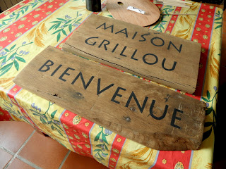 And today I've been in signwriting mode. I've been making various wooden signs out of some ancient oak floorboards that we found in one of the outbuildings when we arrived here; I really like the idea of Grillou's original floorboards taking on a new life to welcome people here. Here are two of today's creations, with their 'captions' painted, and just now waiting for their protective coating before they take their place outside at the end of the drive: